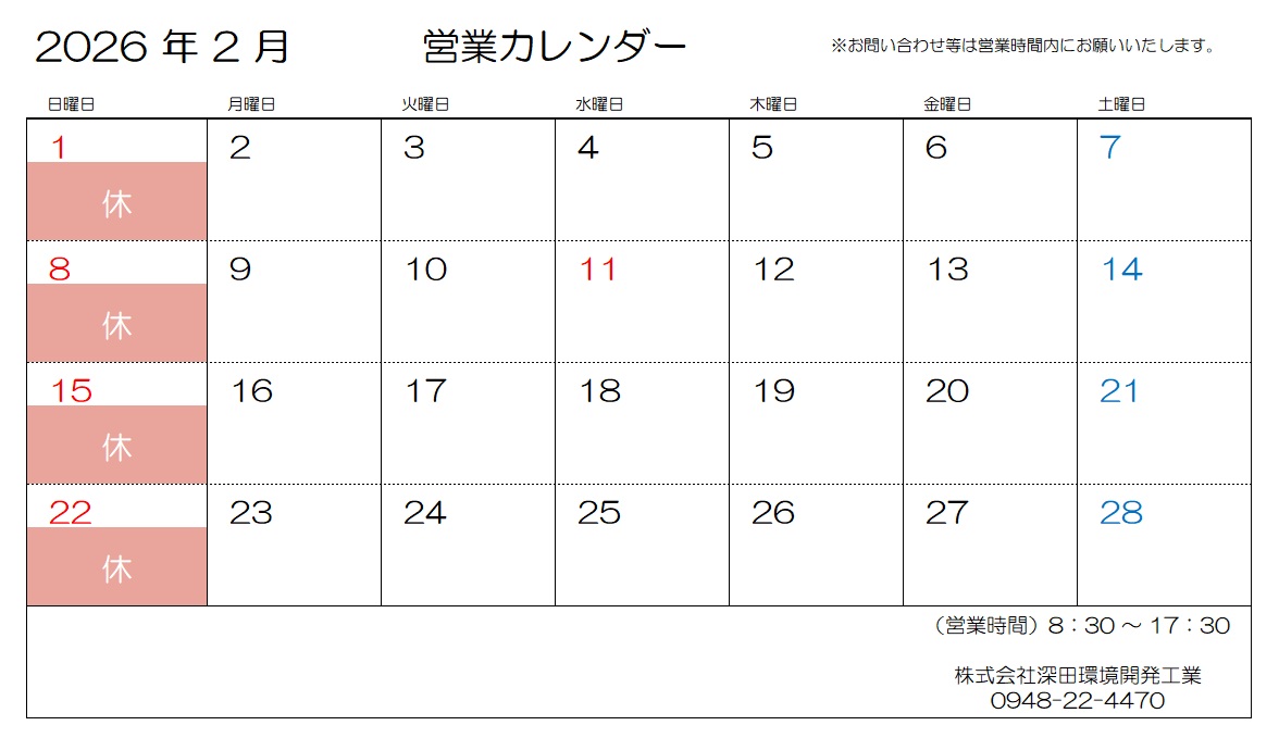 2026年2月の営業カレンダー ※お問い合わせ等は営業時間内にお願いいたします。